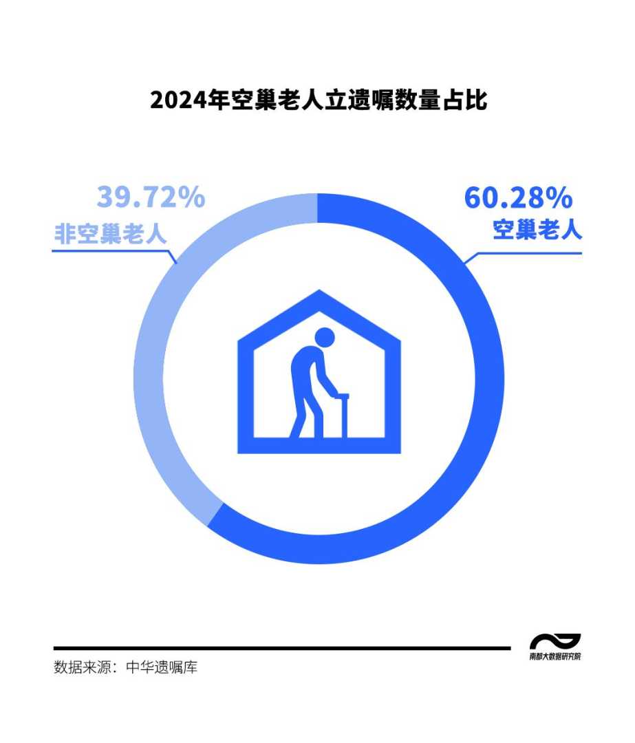 值得注意的是,2024年全国60岁以上老年人遗嘱登记总量为40176份,其中空巢老人占比高达60.28%,北京、上海、广东等地成为主要集中区域,三地空巢老人遗嘱登记量占比超过77%。此外,11.59%的空巢、孤寡老人选择将财产留给孙辈等非法定继承人,这一趋势反映出传统继承模式的突破。