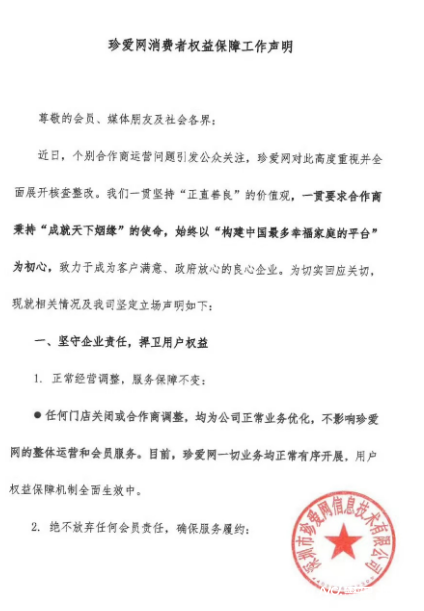珍爱网表示,将严格监督服务质量,确保所有已签署的婚恋服务协议得到完整履行,保障会员权益。