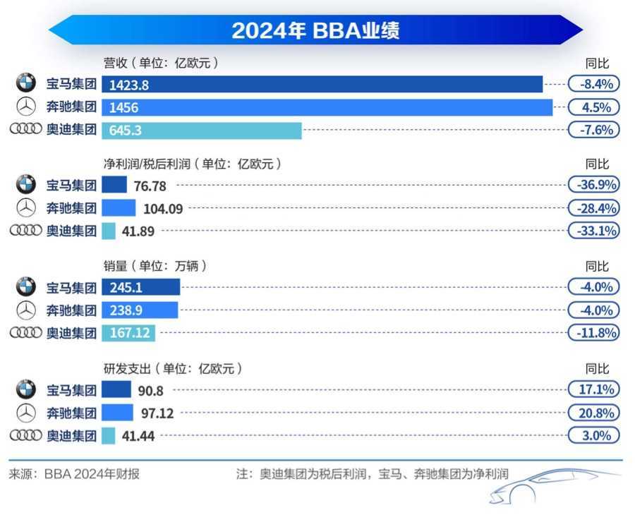 日前,传统豪华汽车三巨头BBA(奔驰、宝马和奥迪集团)相继披露了其2024年财报,引发市场广泛关注。