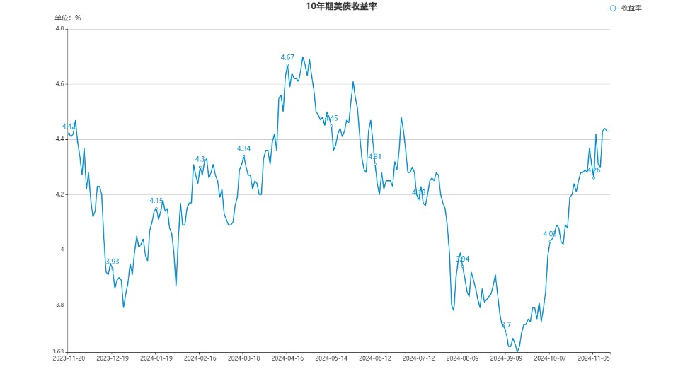 海外债市:上周美国国债收益率整体上涨,10年期美债收益率周涨12.72BP,报4.4315%,美联储官员的鹰派表态和经济数据打击了市场对降息的预期。