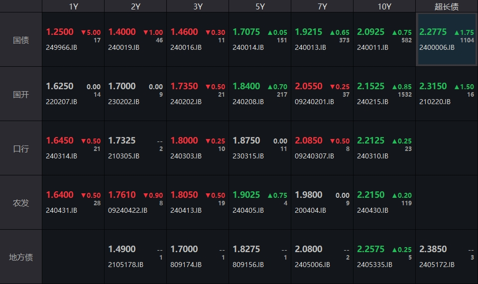 今日,10月经济运行数据正式揭晓,30年特别国债续发中标利率确定为2.2741%,标志着2024年总额达1万亿元的超长期特别国债发行圆满收官。债市方面,长短端走势呈现出明显分化,5-30年期限的国债利率均有所上行。具体来看: