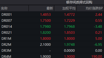 资金面方面,Shibor短端品种多数上行,其中隔夜品种上行1.4BP至1.47%,7天期上行1.1BP至1.685%。银银间市场回购定盘利率涨跌互现,FDR001报1.4700%,较上日上涨1个基点;FDR007报1.7500%,与上日持平;FDR014报1.8000%,较上日下行3个基点。银行间市场回购定盘利率多数下行,FR001报1.6500%,与上日持平;FR007报1.8500%,较上日下行4个基点;FR014报1.8800%,较上日下行2个基点。