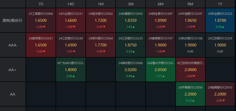 (数据来源:WIND,财联社整理)存单方面,今日3个月期国股存单需求较好,利率在1.70%-1.85%之间,较前一日上行1.63bp;1年期国股存单利率报在1.86%-1.92%之间,较前一日上行0.5bp。AAA级存单方面,9个月期成交利率为1.9%,1年期成交利率同样为1.9%。