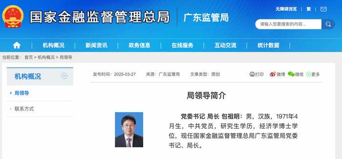 3月27日,根据国家金融监督管理总局广东监管局官网消息,国家金融监督管理总局深圳监管局原党委书记、局长包祖明已正式出任国家金融监督管理总局广东监管局党委书记、局长。这一人事变动在金融行业内引起了广泛关注,预计将对广东地区的金融监管产生深远影响。