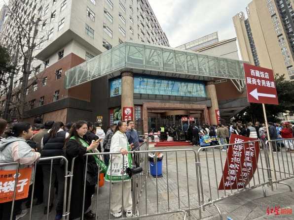 3月20日下午三点半,酒店展开展首日,微成都探访了西藏饭店——食品饮料的主要展览地,发现入场队伍已长达十米,需排队十分钟方能入场。