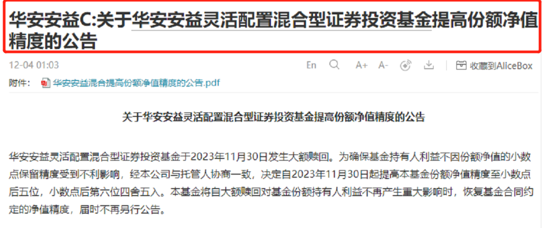 12月4日,华安基金公告显示,旗下华安安益灵活配置混合基金因11月30日发生大额赎回,决定自当日起提高A类份额净值精度至小数点后五位。鹏扬基金也于12月2日发布公告,旗下鹏扬淳开债券D类份额因同样原因,决定于11月30日起保留8位小数。