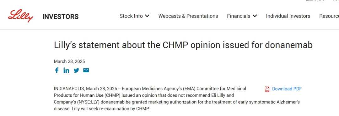 欧洲药品监管机构否决了礼来公司阿尔茨海默病新药donanemab的上市申请,称药物减缓认知衰退的能力不足以抵消严重脑肿胀风险。礼来股价在市场大跌中逆市走高,但仍计划请求对决定进行重新审查。