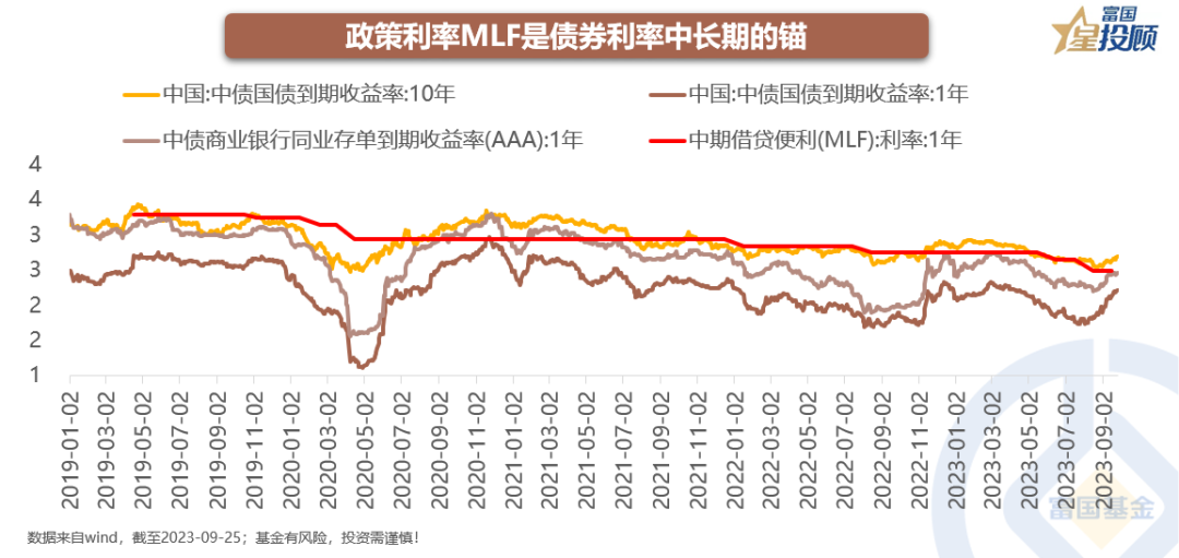 政策利率,特别是中期借贷便利(MLF)利率,是债券利率中长期的指引。国债收益率曲线、同业存单等市场利率均围绕MLF利率波动。