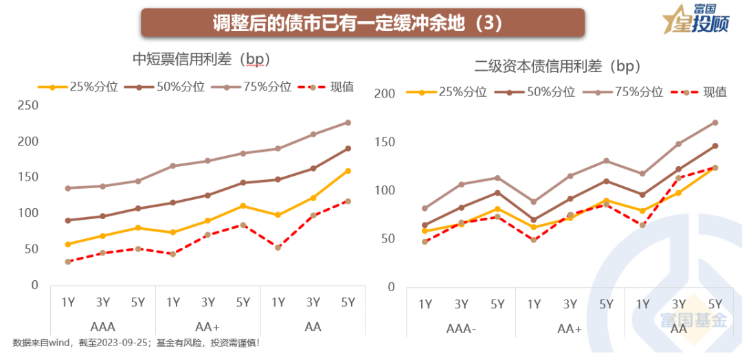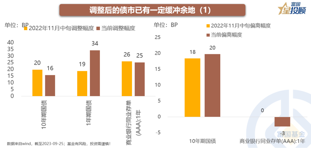 当前10年期国债、1年期国债、1年期AAA同业存单利率均有所上升,长端调整幅度与去年11月相当,短端调整更大。债券利率与政策利率利差也反映出当前债市调整程度。