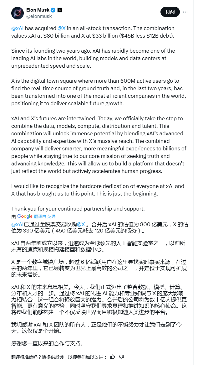 马斯克称:“xAI和X的未来紧密相连。我们正式迈出整合数据、模型、算力、分发渠道和人才的关键一步。合并将释放巨大潜力,结合xAI的人工智能能力与X的影响力。”