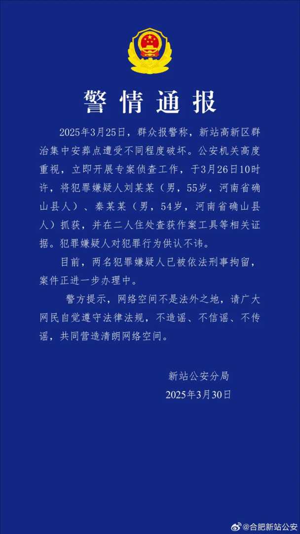 3月30日凌晨,安徽合肥市公安局新站分局正式发布警情通报,揭露了事件的调查进展。通报指出,3月25日,有群众报警称新站高新区群治集中安葬点遭受了不同程度的破坏。对此,公安机关高度重视,迅速启动专案侦查程序。经过紧张高效的侦查工作,警方于3月26日10时许成功抓获犯罪嫌疑人刘某某(男,55岁,河南省确山县人)和秦某某(男,54岁,河南省确山县人),并在其住处查获了作案工具等关键证据。两名犯罪嫌疑人均对自身的犯罪行为供认不讳。