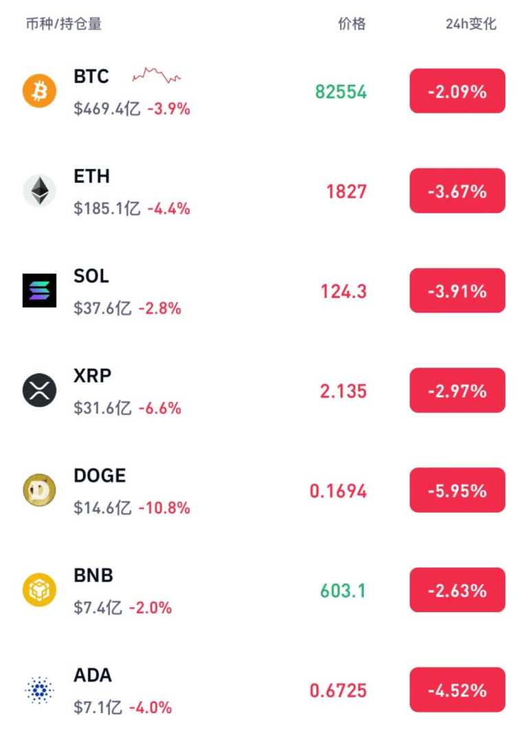 截至最新数据,比特币跌幅超过2%,报价为82554美元/枚,以太坊则接近4%的跌幅,狗狗币更是下跌近6%。