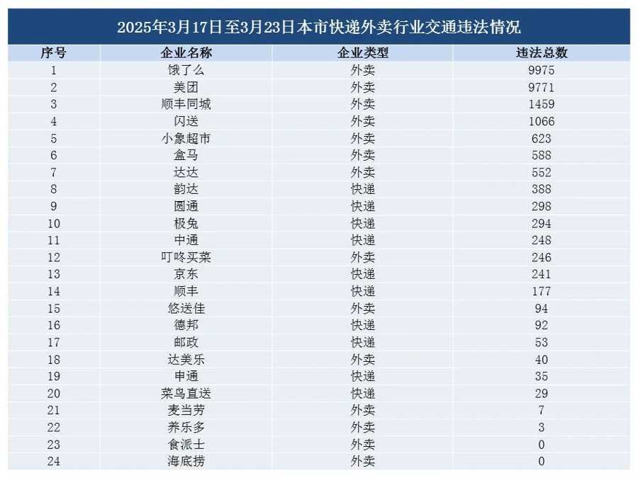 上海公安交管部门公布了3月17日至3月23日期间的快递外卖行业交通违法和交通事故情况,饿了么、美团等外卖骑手违法总数居前。交管部门持续加大对非机动车违法行为的查处力度,加强行业监管,督促企业落实交通安全主体责任。