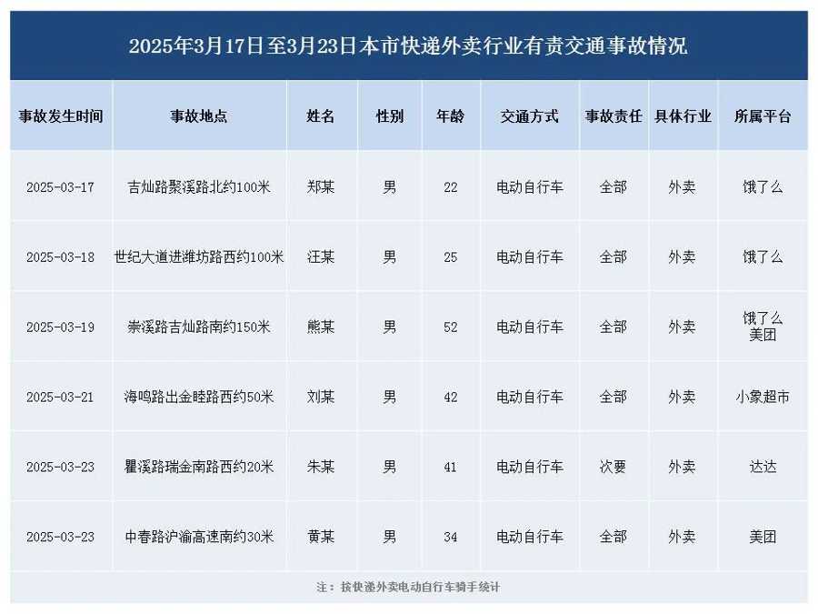 除了违法总数,交管部门还通报了一周内本市外卖快递行业有责交通事故情况,多名骑手因违反交通规则被判定全责。这些事故不仅给受害者带来伤害,也影响了城市交通秩序。