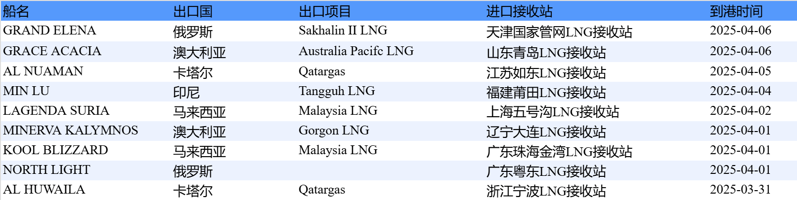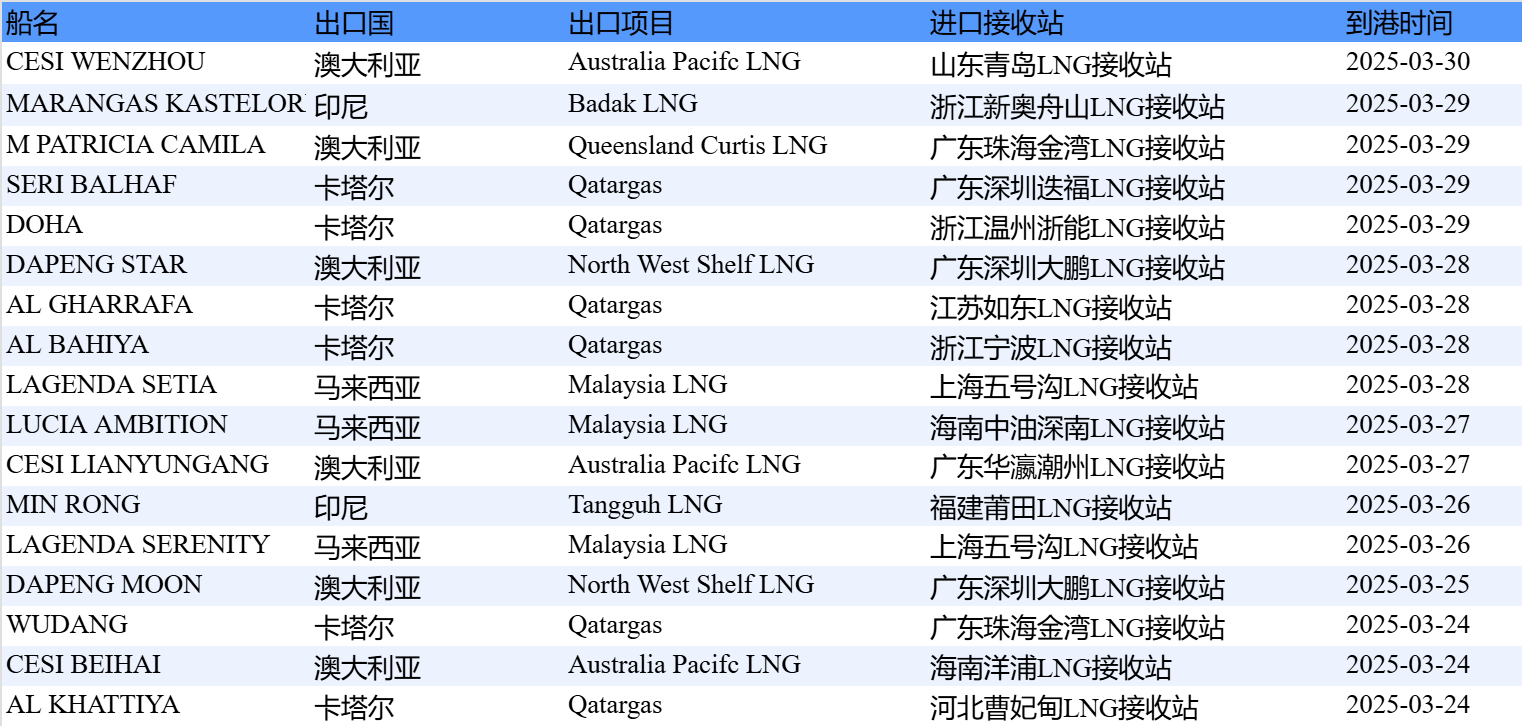 从到货地区分布来看,3月24日至3月30日,华南地区接收9船LNG,长三角地区6船,环渤海地区2船。其中,珠海LNG接收站表现突出,到港2船,共计约15万吨。