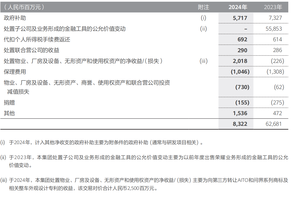由于外部原因,华为在2020和2021年分别处置了超聚变和荣耀业务,相关资产处置收入陆续在过去并入华为报表中。在2023年的财报中,华为公布的净收支中,处置子公司及业务形成的金融工具的公允价值变动为558.53亿元,也拉高了当年的利润水位,而这项收入在2024年为零。