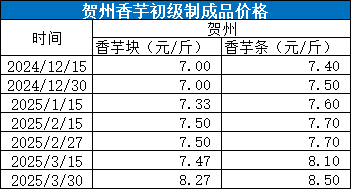 截至2025年3月30日,贺州香芋块价格为8.27元/斤,环比上涨10.71%;贺州香芋条价格为8.50元/斤,环比上涨4.94%。新华财经提醒,本文仅供参考,不构成投资建议,投资者需谨慎评估风险。