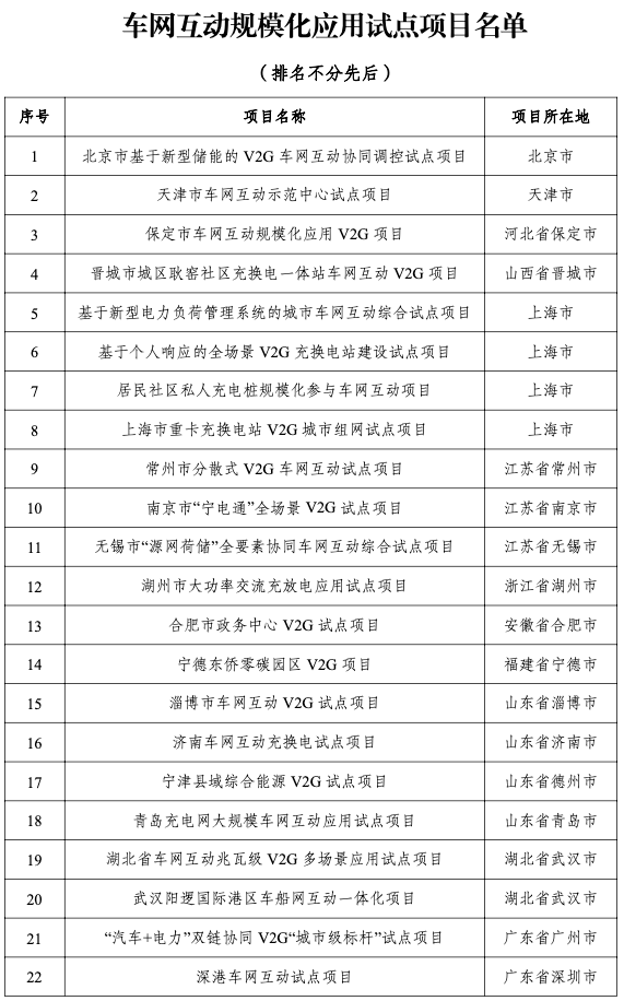 国家发展改革委办公厅、国家能源局综合司、工业和信息化部办公厅、市场监管总局办公厅联合发布通知,为支撑新型能源体系和新型电力系统,促进新能源汽车与电网融合互动,根据相关政策文件要求,联合组织开展了车网互动规模化应用试点申报及评审工作。现将首批车网互动规模化应用试点名单公布,涵盖上海市等9个城市及30个具体项目。
