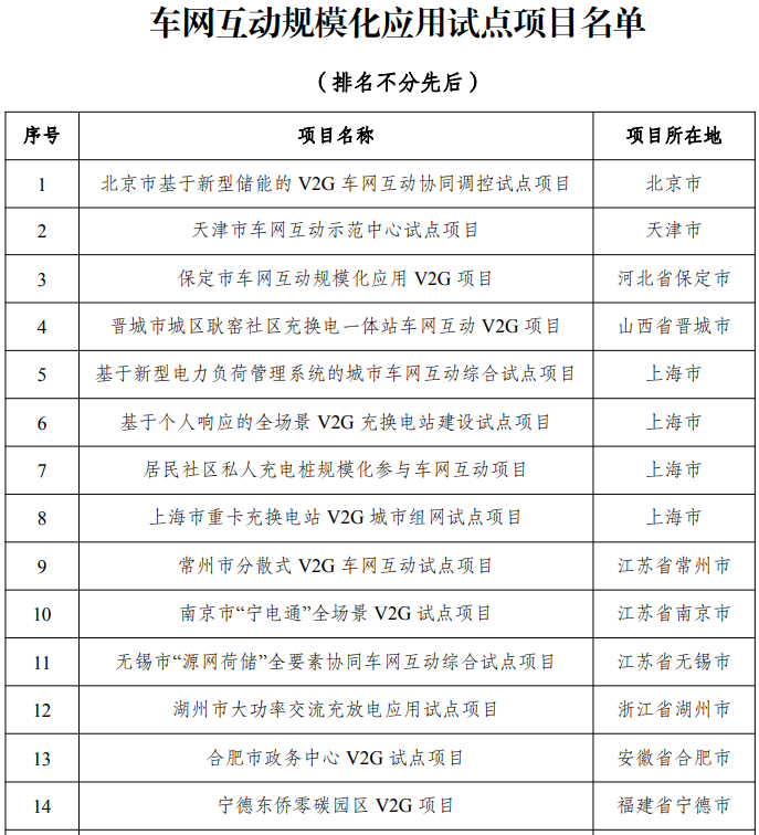 经专家评审,上海市等9个城市以及“北京市基于新型储能的V2G车网互动协同调控试点项目”等30个项目成功入选首批车网互动规模化应用试点范围。