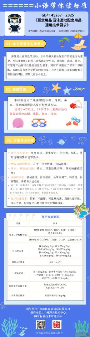 《婴童用品游泳运动配套用品通用技术要求》国家标准针对6到14岁儿童的泳帽、泳镜等产品,明确了防水性、舒适性等量化指标,并严格限定了邻苯二甲酸酯、双酚A等有害物质的迁移量,这将有力推动产品质量的提升。