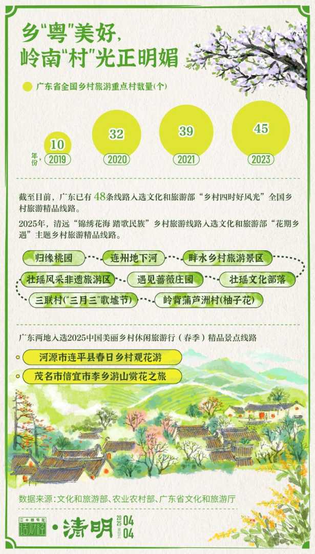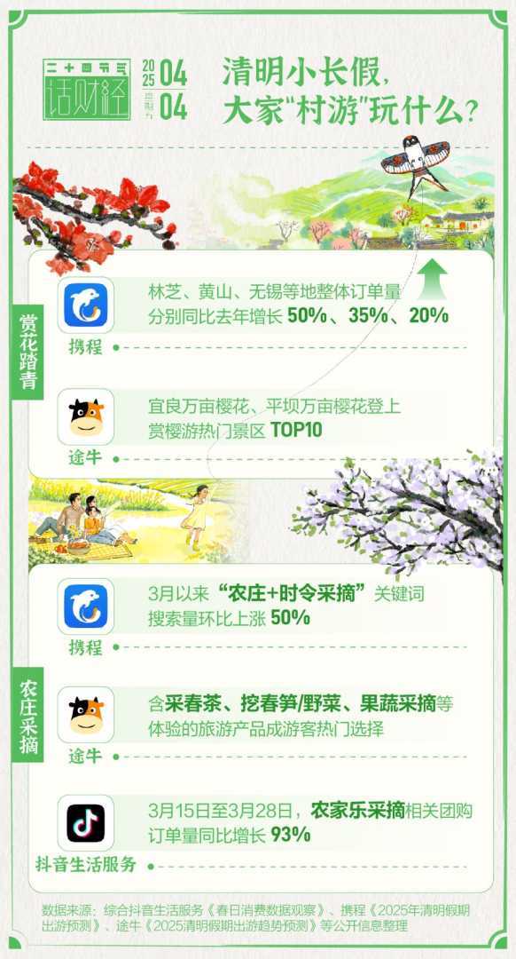 清明时节,春花烂漫,西藏林芝桃花如云似霞、黄山古村落间梯田油菜花盛放、贵州平坝万亩樱花铺满山野。据央视新闻报道,线上平台数据显示,2025年3月,乡村游产品预订量同比2024年增长52%,“赏花+非遗”线路热度大增。赏花、民宿度假、非遗体验、农庄采摘等乡村旅游业态亮点纷呈。