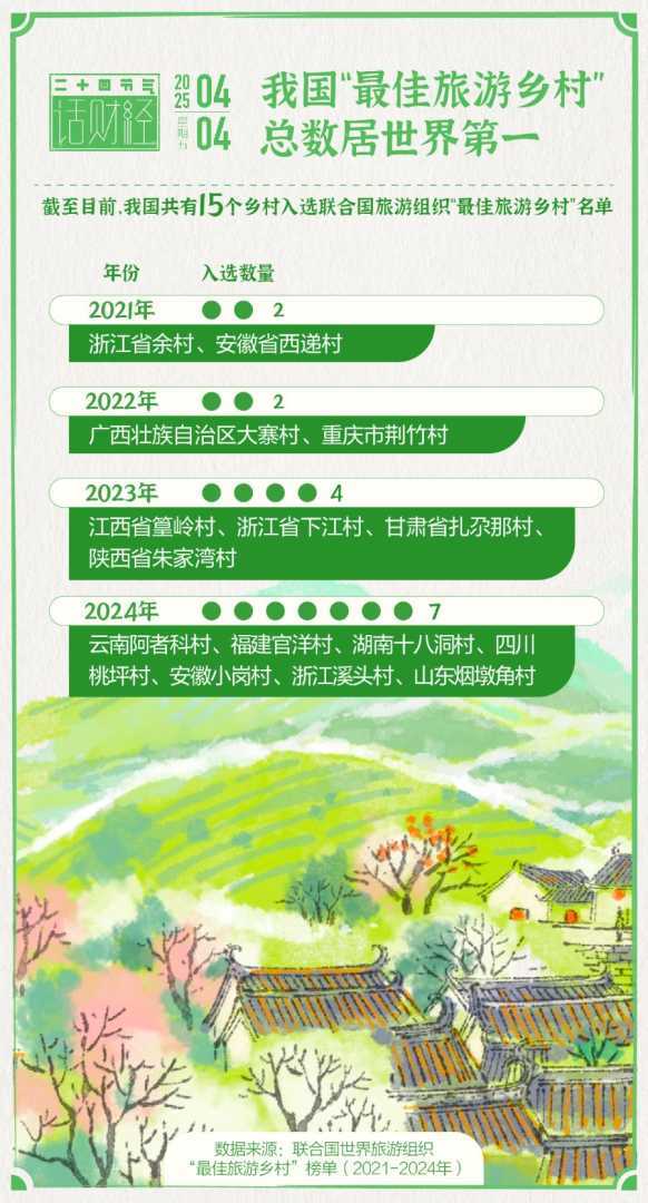 乡村旅游市场持续升温,宝藏乡村备受关注。浙江安吉余村、湖南十八洞村等凭借独特魅力吸引游客。我国共有15个乡村入选联合国旅游组织“最佳旅游乡村”名单。