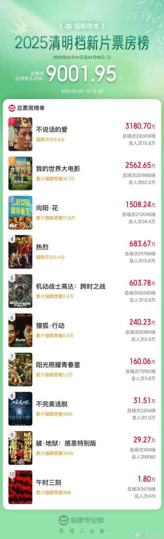据猫眼专业版数据显示,2025年清明档期电影市场迎来开门红,4月4日10时55分,清明档新片总票房已突破9000万元大关。《不说话的爱》《我的世界大电影》以及《向阳·花》三部影片凭借出色的表现,暂时位列清明档新片票房榜的前三位,为观众带来了丰富的观影选择。