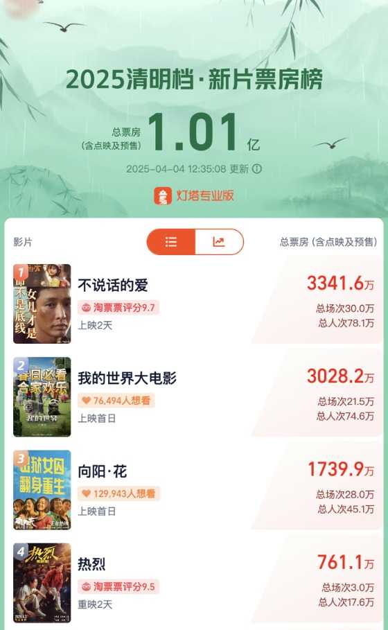 2025年清明档新片总票房成功破亿,《不说话的爱》《我的世界大电影》《向阳·花》暂列票房榜前三位,彰显了国内电影市场的强劲复苏态势和影片质量的整体提升。