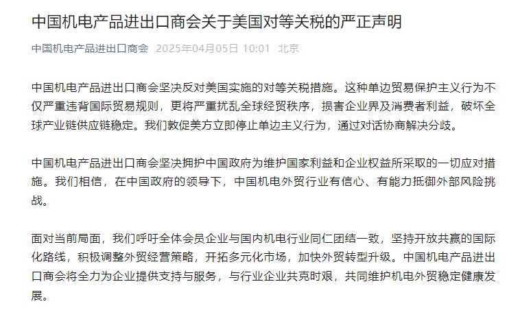 中新网4月5日电据“中国机电产品进出口商会”微信公众号消息,中国机电产品进出口商会5日就“美国对等关税”一事发表声明。