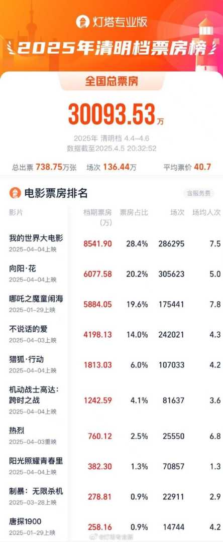 截至2025年4月5日20时32分,清明档电影档期票房已突破3亿元。《我的世界大电影》领跑票房榜,《向阳·花》和《哪吒之魔童闹海》分列二、三位。这一波热潮再次证明了国内观众对高质量影片的强烈需求。