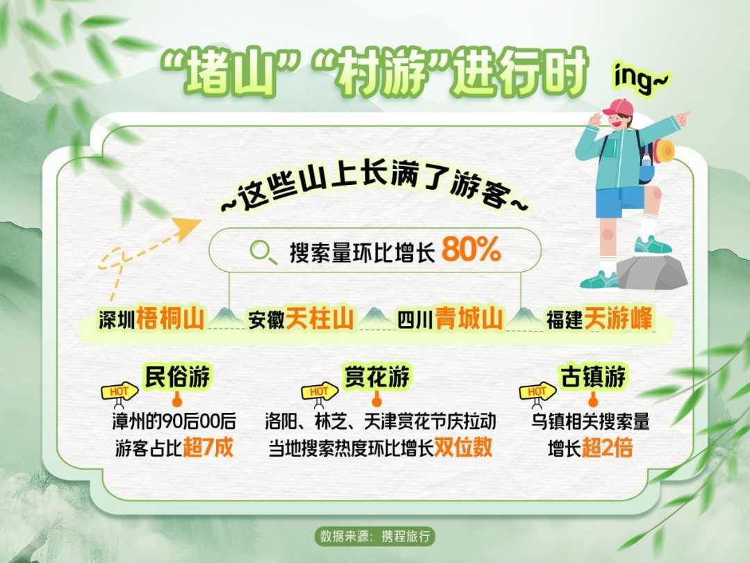 今年清明,“堵山”取代“堵车”成为热议话题,多个山岳类风景区发布限流公告。携程数据显示,近一周内,深圳梧桐山、安徽天柱山、四川青城山、福建武夷山天游峰等景区搜索量环比涨幅均超过80%,旅游市场回暖趋势明显。