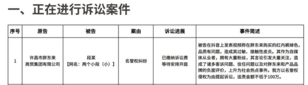 网红“两个小段”因发视频称胖东来红色内裤掉色还过敏,被胖东来起诉名誉侵权,追责金额不低于100万元。案件正在等待开庭,此前胖东来已下架相关产品并道歉。网红否认职业打假人指控,已报案。