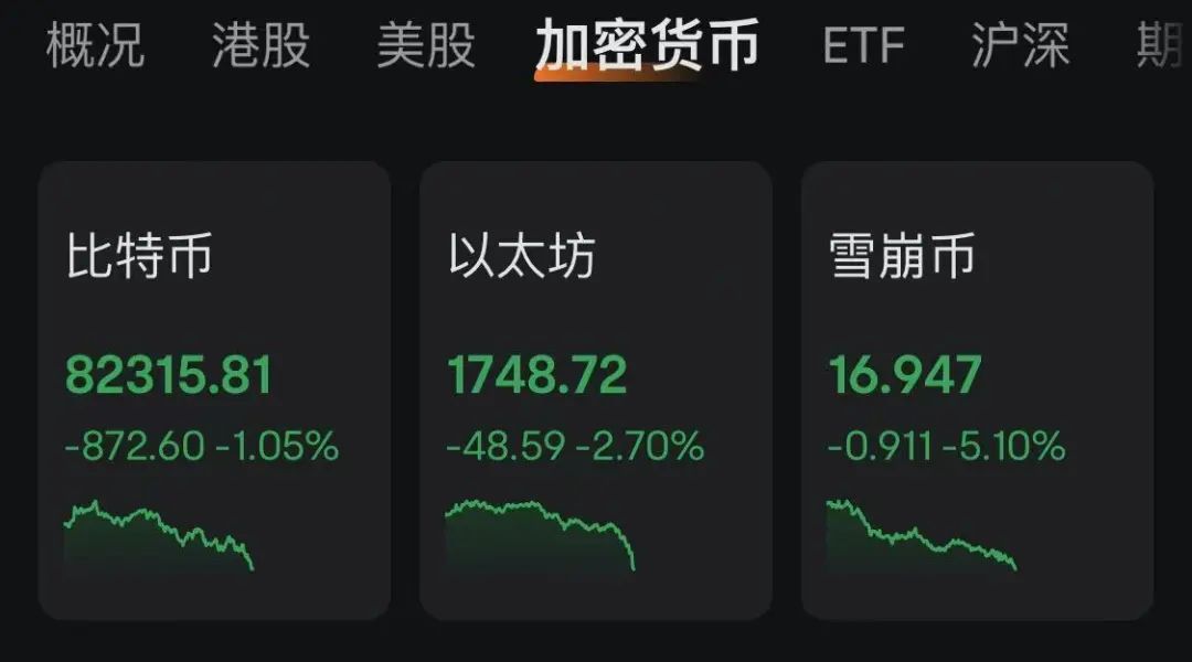 以太坊、狗狗币、特朗普币等主流加密货币也纷纷下跌,跌幅分别超过2%、3%和4%,雪崩币更是暴跌逾5%。