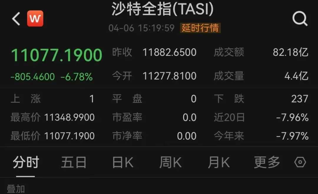 值得注意的是,沙特股市今日率先开盘后暴跌,截至收盘跌幅接近7%。分析指出,特朗普关税政策的影响以及原油价格的暴跌是导致沙特股市大跌的重要因素。