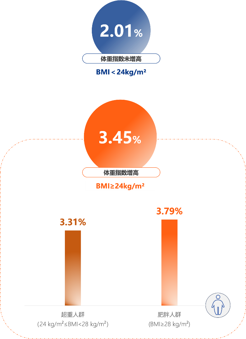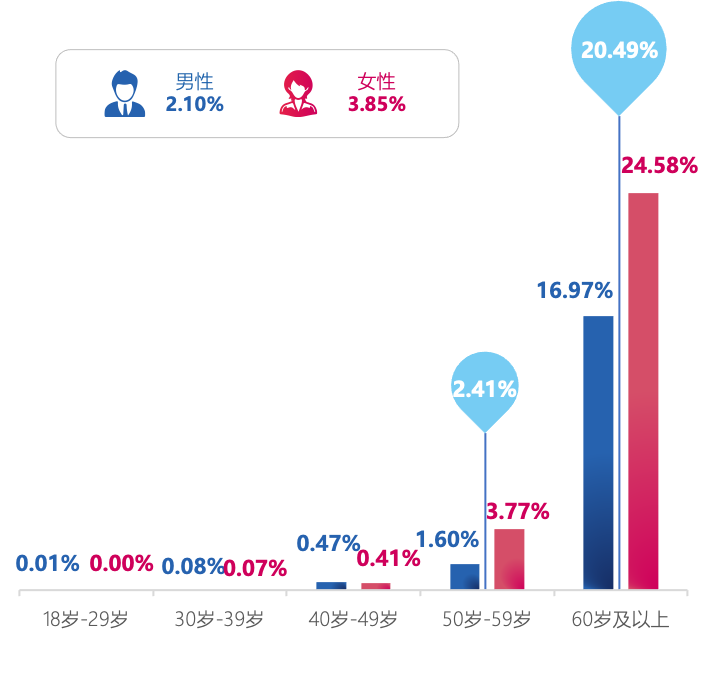 《蓝皮书》中的数据为我们敲响了骨关节健康的警钟。在参与骨关节的骨力宝-膝关节正位健康评估(iKangAI+)的101,878人中,膝关节骨关节炎的检出率为2.80%。年龄与膝关节健康状况紧密相关,60岁以后膝关节骨关节炎的检出率从50-59岁人群的2.41%飙升至20.49%,近乎增长10倍。此外,体重指数(BMI)与膝关节骨关节炎也有着密切联系,BMI增高(BMI≥24 kg/m²)人群膝关节骨关节炎检出率是未增高(BMI<24 kg/m²)人群的1.72倍,肥胖成为膝关节骨关节炎的重要危险因素之一。