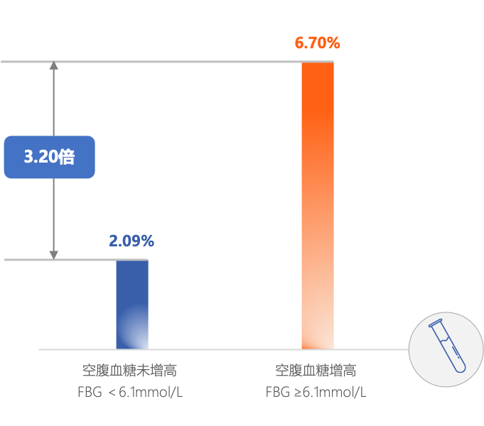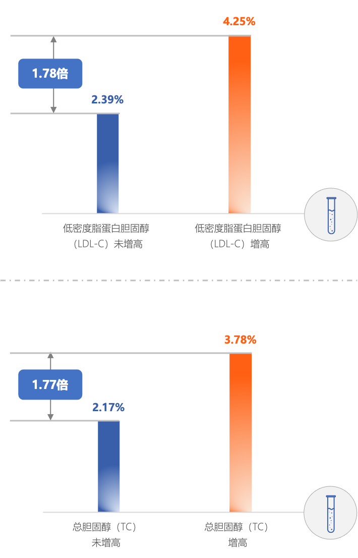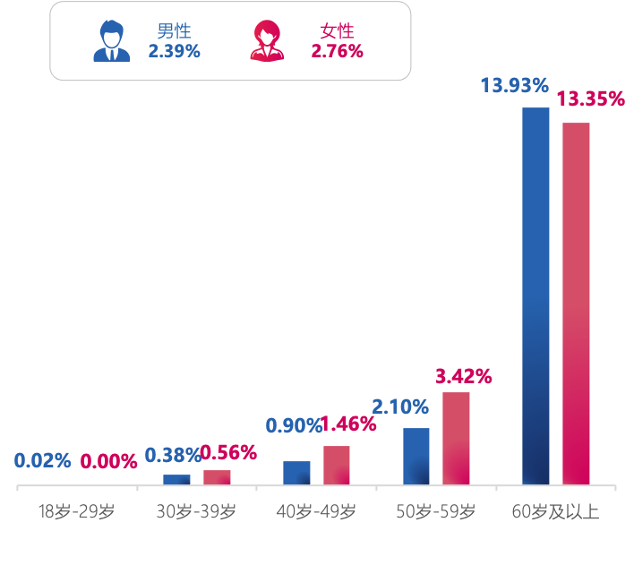 在髋关节方面,《蓝皮书》数据显示,参与骨关节的骨力宝-髋关节正位健康评估(iKangAI+)的82,684人中,髋关节骨关节炎的总体检出率为2.59%。当年龄超过60岁,男性和女性的检出率均突破13%,风险急剧上升。同时,血糖、血脂等指标也与髋关节骨关节炎存在关联,空腹血糖增高人群髋关节骨关节炎检出率是未增高人群的3.20倍;低密度脂蛋白胆固醇增高人群及总胆固醇增高人群的髋关节骨关节炎检出率均是未增高人群的1.7倍。