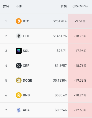 加密货币市场大跌,比特币一度跌破75000美元