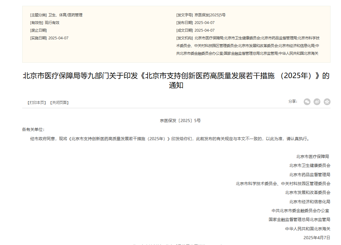 据北京市医疗保障局网站消息,为进一步加速北京市医药健康产业创新,推动创新药、创新医疗器械高质量发展,4月7日,北京市医疗保障局、北京市卫生健康委员会等九部门联合印发了《北京市支持创新医药高质量发展若干措施(2025年)》,围绕临床试验、审评审批、创新医药生产流通、临床使用、人工智能赋能、投融资支持、产业布局和保障措施等方面,提出了32条具体举措。
