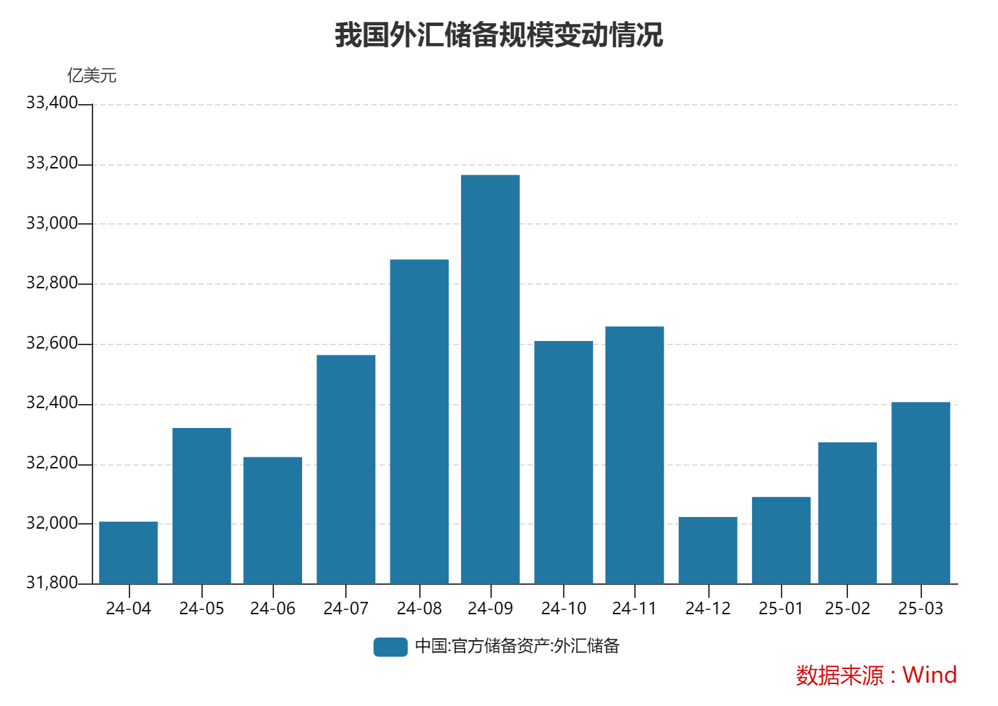 4月7日,国家外汇管理局公布了2025年3月末的外汇储备规模数据。截至2025年3月末,我国外汇储备规模达到32407亿美元,较上月末上升134亿美元,升幅为0.42%。