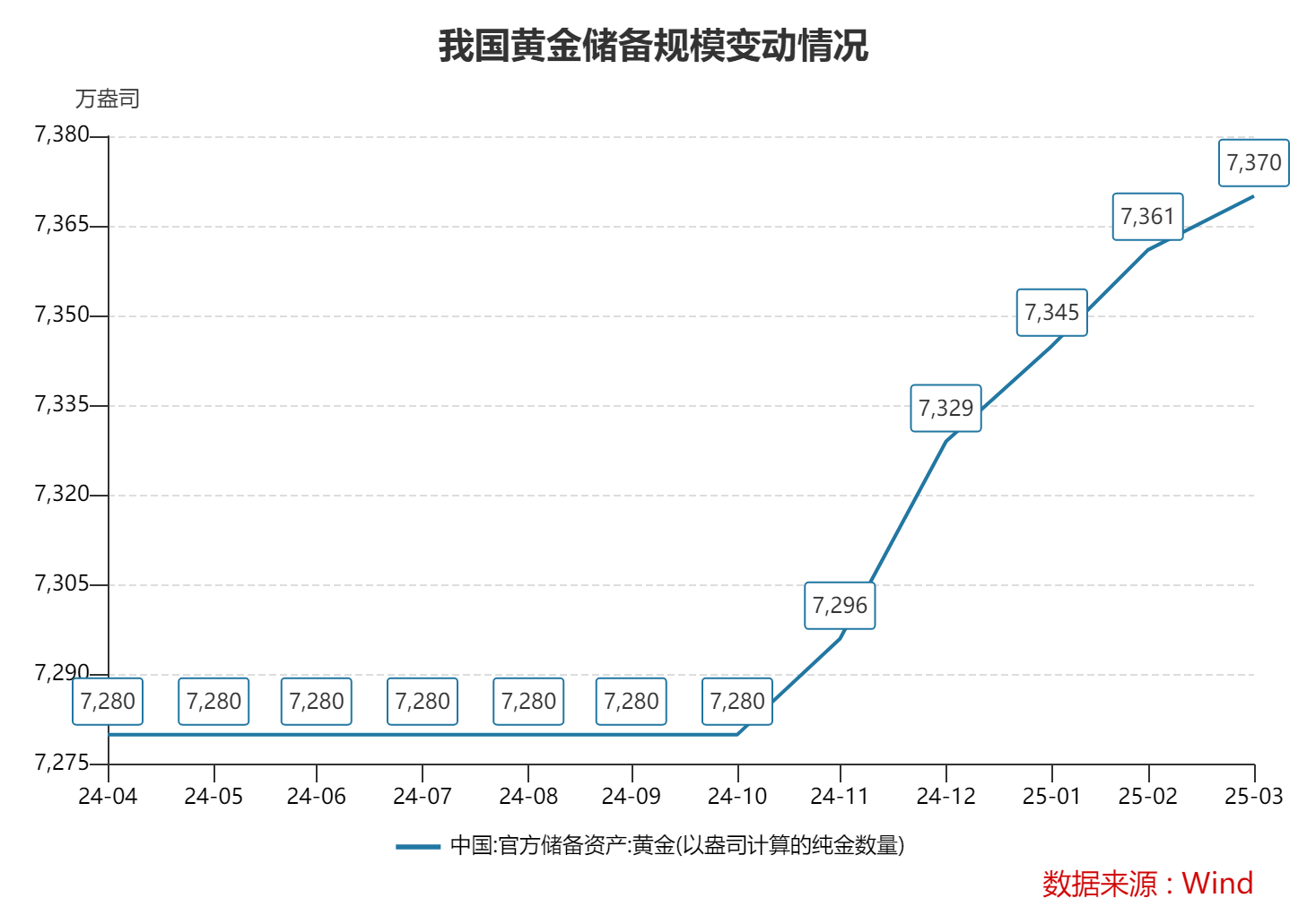 值得注意的是,2025年3月末,官方黄金储备达到7370万盎司,较上月末增加9万盎司,这标志着央行连续第五个月增持黄金。