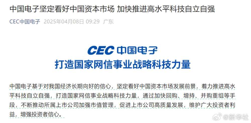 中国电子信息产业集团有限公司8日正式宣布,基于对中国经济长期向好的坚定信心,中国电子持续看好中国资本市场的发展潜力,正加速推进高水平科技自立自强战略。中国电子将全力打造国家网信事业的核心科技力量,通过回购、增持股份、并购重组等多种方式,积极强化所属上市公司的市值管理,以此推动上市公司实现高质量发展,保障广大投资者的权益,并进一步增强市场投资者的信心。此举不仅展现了中国电子对未来市场的乐观预期,也体现了其在科技自立自强道路上的坚定步伐。