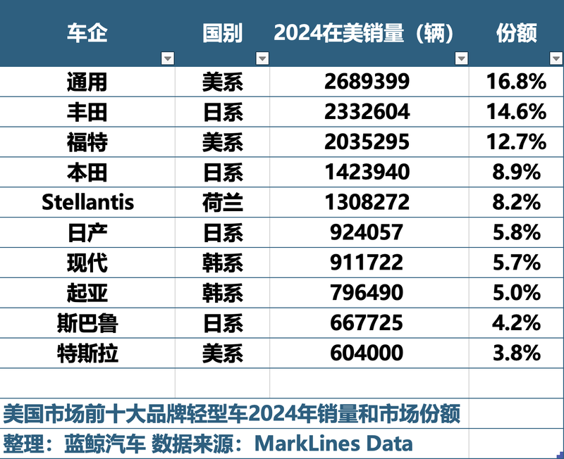 另据蓝鲸汽车梳理调研公司MarkLines数据获悉,2024年在美销量前十车企中,有7席为非美系,其中日系车占据四席,分别为丰田、本田、日产、斯巴鲁,在美市场份额合计约33.5%,丰田去年在美销量超233万辆,仅次于通用。