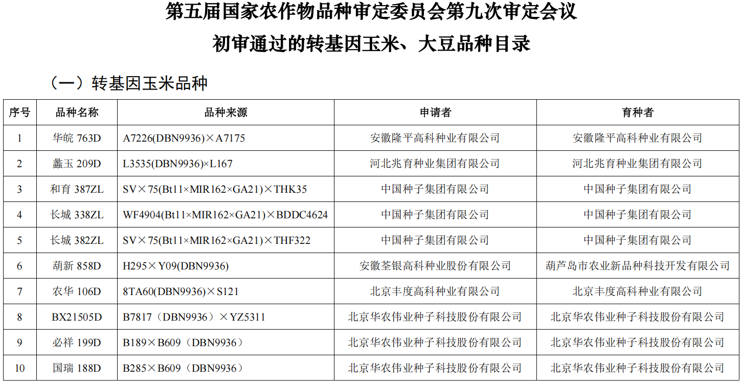 4月8日,国家公示第五届国家农作物品种审定委员会第九次品种审定会议初审通过的转基因玉米、大豆品种名单及相关信息,涉及大北农、隆平高科等多家农业上市公司,引发广泛关注。