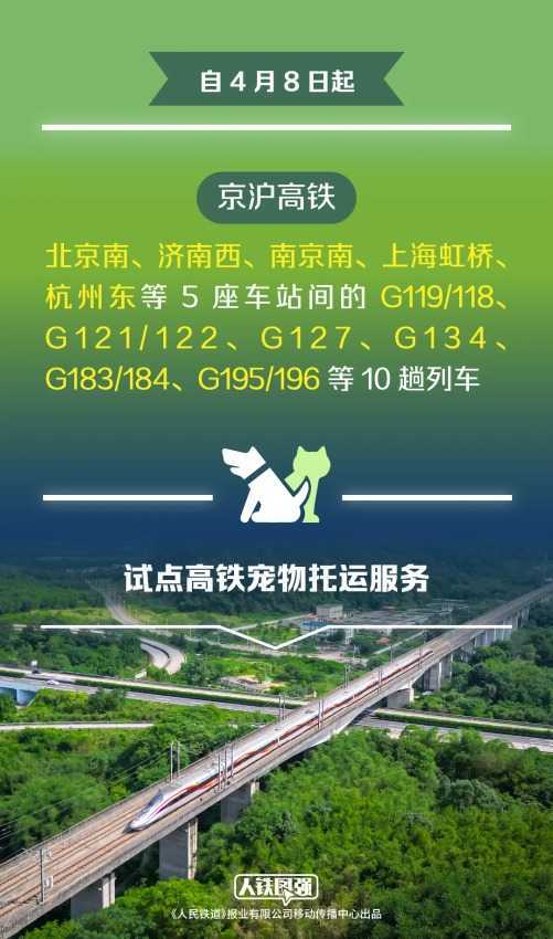4月10日,首趟可托运宠物的高铁列车G119次从北京南站始发,实现了人宠同车出发、同时抵达。托运宠物需提前两天预约,京沪高铁10趟列车试点,费用按里程梯次计费。