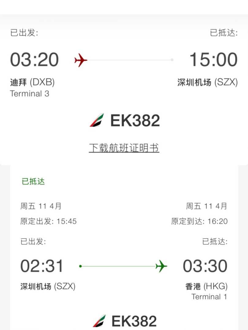 南都记者从阿联酋航空官网了解到,4月11日,该趟航班已顺利抵达香港。
