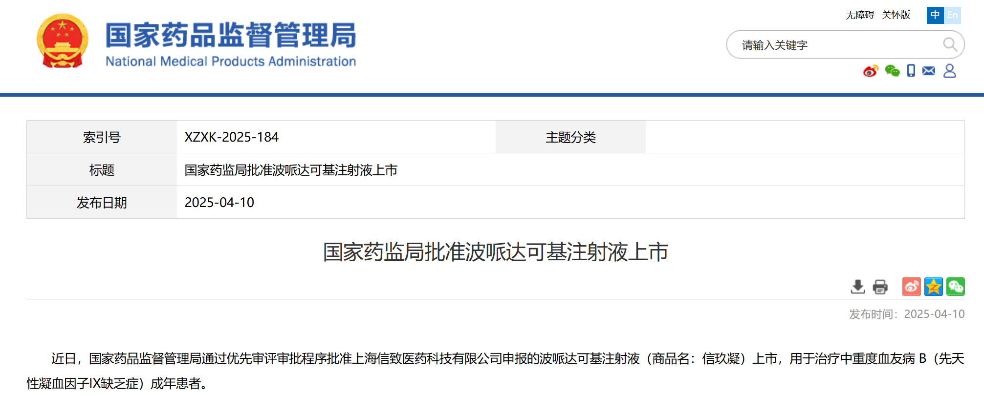 4月10日,国家药品监督管理局官网显示,上海信致医药科技有限公司申报的波哌达可基注射液(商品名:信玖凝)通过优先审评审批程序获批上市,该药物针对的是中重度血友病B(先天性凝血因子IX缺乏症)成年患者。信玖凝不仅是国内首个获批的血友病B基因治疗药物,也是上海市今年第三款获批上市的国产1类创新药。