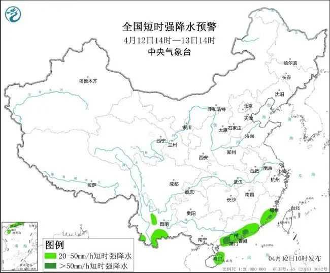预计4月12日14时至13日14时,华南南部等地部分地区将有8级以上雷暴大风或冰雹,其中福建东南部、广东中南部等地部分地区将有10级以上雷暴大风,最大风力可达11级以上;华南南部、西南地区南部等地部分地区将有短时强降水,小时雨量大于20毫米,其中福建东南部、广东南部等地部分地区小时雨量大于50毫米,最大可达60毫米以上。