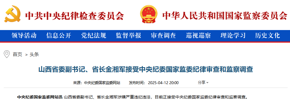 中央纪委国家监委网站4月12日晚8点消息,山西省委副书记、省长金湘军涉嫌严重违纪违法,目前正接受中央纪委国家监委纪律审查和监察调查。此消息引起了社会广泛关注,金湘军作为高级官员,其行为备受瞩目。