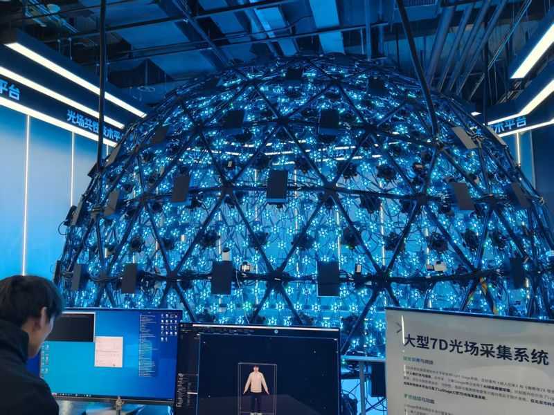 走进北京元客方舟科技有限公司MAC元宇宙演艺制播科技中心,一个显眼的巨型装置映入眼帘——100多台相机与750多个光源共同构建而成,直径达6.6 米,宛如一个科技感十足的“大球”。这个装置名为LuStage-F7D人脸光场重建系统,主要承担着数字人的采集与重建工作。