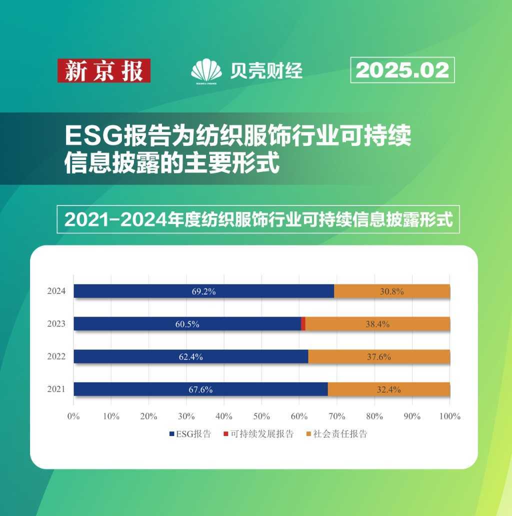 近四年,纺织服饰行业上市公司可持续信息披露比例稳步攀升,高于全行业均值。据中诚信绿金数据,2021至2024年间,ESG报告成为主要披露形式,2024年披露比例达69.2%,单独披露占比76.2%。